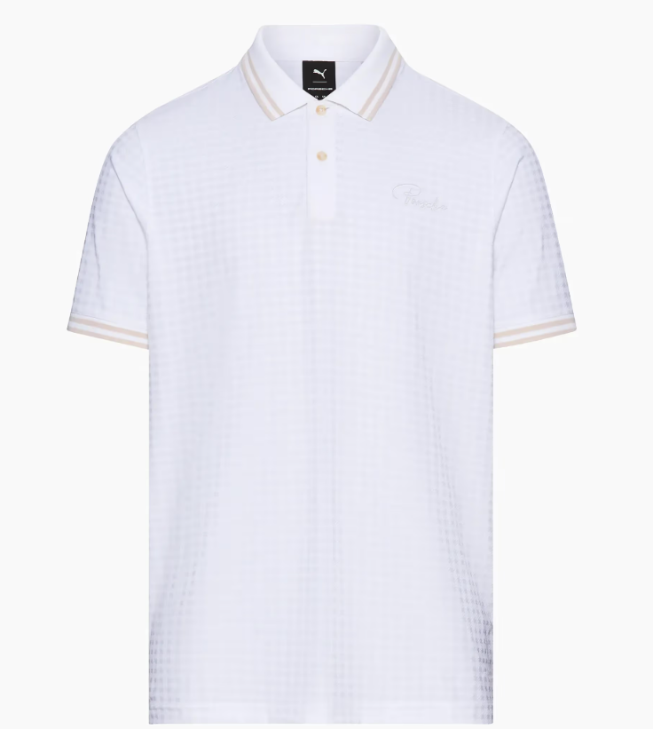 Elegante dentro e fora do campo de golfe, a coleção 911 Targa 60Y combina charme retrô com design atemporal, em homenagem ao 60º aniversário do carro esportivo. A camisa polo apresenta uma impressionante estampa tonal Pepita em tecido jacquard elástico de alta qualidade. O tecido elástico garante máxima liberdade de movimento, tornando a polo a companheira perfeita para um desempenho máximo no campo de golfe.