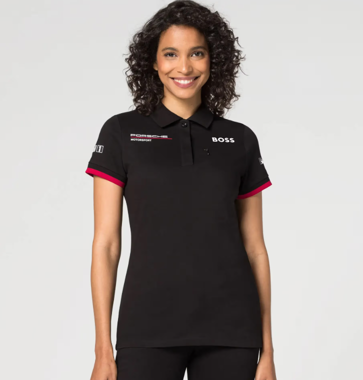 Camisa polo de manga curta em piqué com três botões e selo "PORSCHE MOTORSPORT". Design baseado no uniforme original da equipe Porsche Motorsport. Com o logotipo "PORSCHE" na pala do ombro.