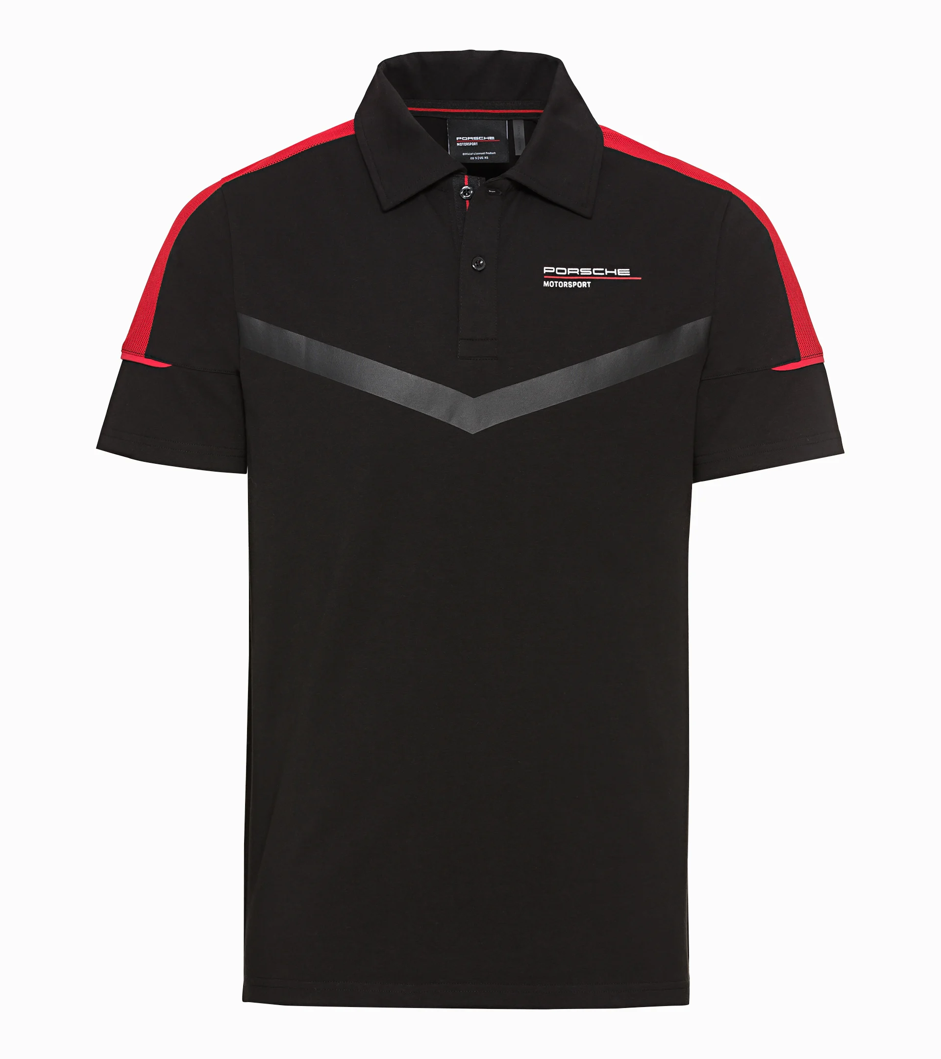 A camisa polo masculina com um grande logotipo "PORSCHE MOTORSPORT" na frente e um logotipo tonal da Porsche nas costas deixa claro à primeira vista para qual time você torce na pista.
