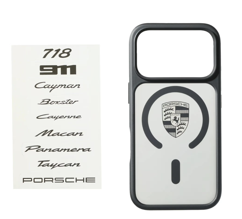 Desempenho Porsche – no seu bolso: a capa premium para iPhone® 17 Pro, com design atemporal, exibe o icônico brasão da Porsche. A moldura de alumínio para a câmera adiciona um toque de estilo e oferece proteção extra. Graças à compatibilidade com MagSafe, o carregamento sem fio está disponível a qualquer momento. Um destaque especial: a capa pode ser personalizada com os adesivos inclusos com os logotipos dos veículos Porsche.