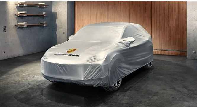 Cobertura para o exterior do veículo de instalação personalizada feita de material repelente de água com um Emblema Porsche colorido e logótipo „PORSCHE“. Incluindo proteção anti-roubo.