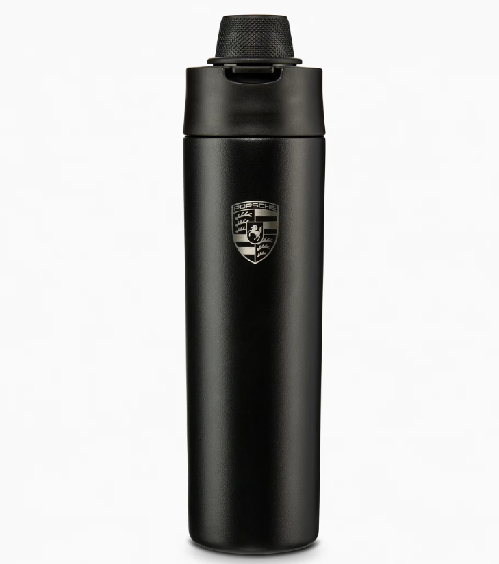 Alto desempenho em qualquer lugar: a garrafa térmica Porsche de parede dupla e à prova de vazamentos, com revestimento em pó preto, mantém bebidas quentes e frias por mais tempo. O corpo da garrafa é decorado com o brasão da Porsche gravado a laser. A tampa é particularmente marcante, com um design que lembra o botão do Modo de Condução em um volante Porsche.