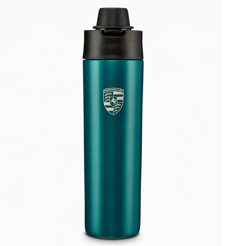 A Coleção Cayenne Electric Lifestyle personifica a essência do dinamismo elétrico além das ruas. Inspirada na paleta de cores "Tons de Verde" do Cayenne, cada peça é uma declaração de estilo – incluindo esta garrafa térmica Porsche de parede dupla e à prova de vazamentos. Ela mantém bebidas quentes e frias na temperatura ideal. A garrafa é adornada com o brasão da Porsche gravado a laser. A tampa é particularmente marcante, com um design que remete ao botão de Modo de Condução em um volante Porsche.