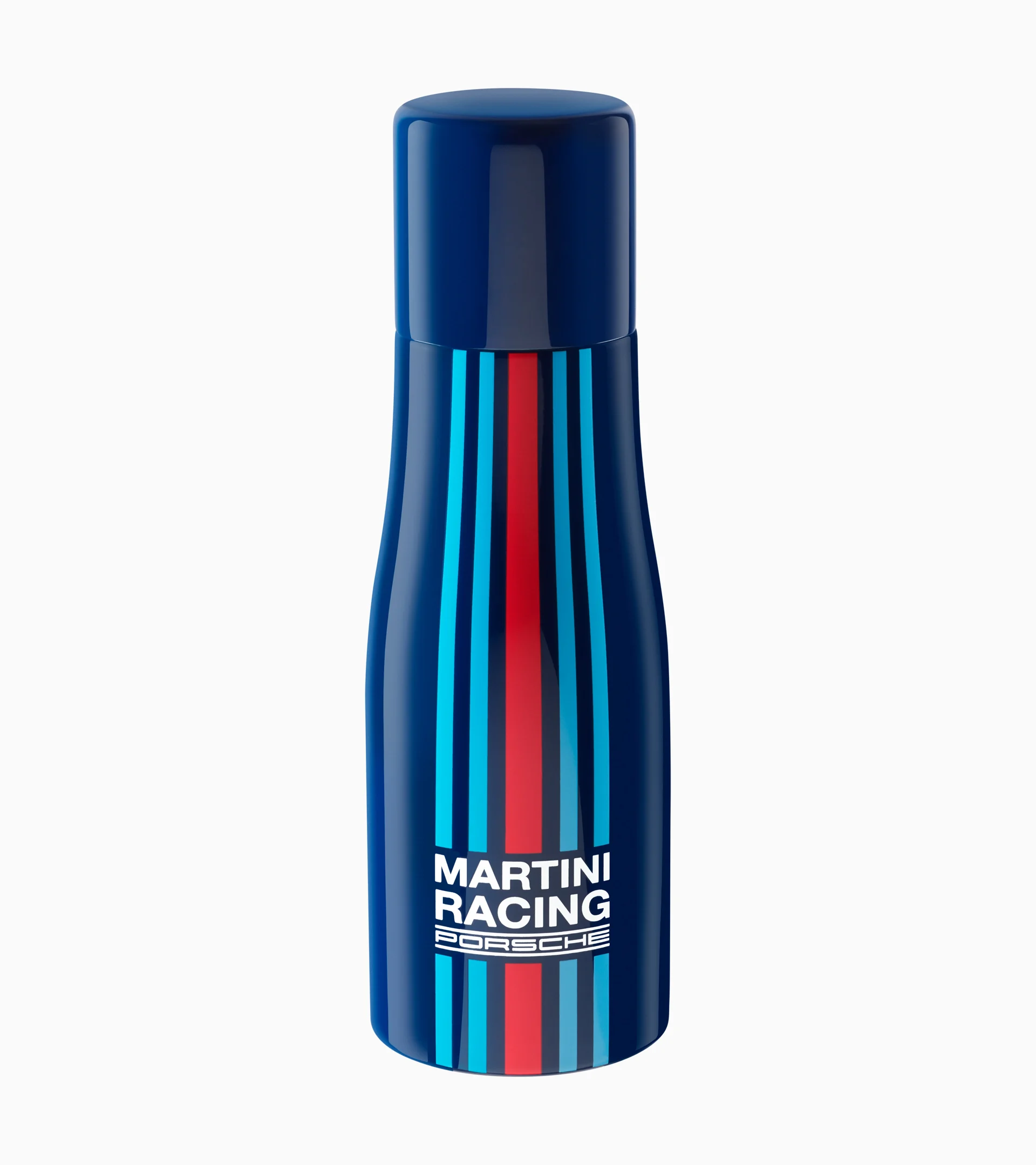 Copo térmico feito de aço inoxidável de alta qualidade com parede dupla nas cores Martini Racing. O copo térmico tem o escudo Porsche do lado de fora. O copo mantém as bebidas quentes quentes e as bebidas frias frias.