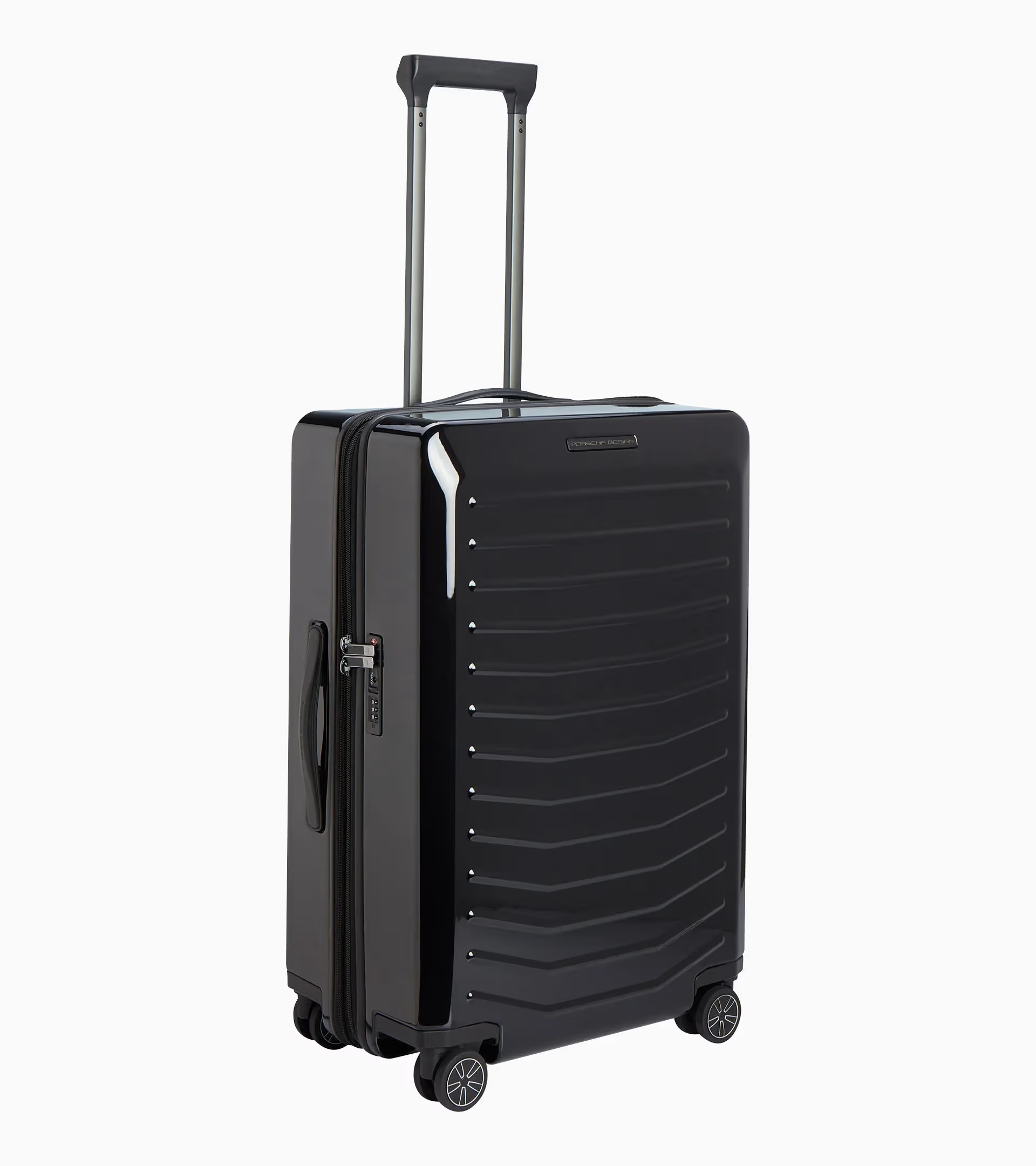 Ultraleve e inspirada nas cores do Porsche 911: a Coleção Roadster Hardcase. Desenvolvida pelo Studio FA Porsche, esta série de malas é feita de policarbonato e é a fusão perfeita de forma, função e design. O carrinho M Porsche Design Roadster Hardcase 4W de tamanho médio impressiona com um peso de apenas 4,1 kg, seu visual dinâmico em um design de aro e o brasão Porsche feito de couro legítimo. Rodas suaves com rolamentos de esferas e um sistema de alça multi-altura com empunhadura ergonômica garantem um desempenho perfeito. É especialmente fácil colocar bolsas sobre a alça e removê-las novamente, graças às suas bordas arredondadas. O interior dividido também é versátil – e pode ser expandido espontaneamente a qualquer momento. Um zíper bidirecional ultra seguro e um cadeado TSA protegem sua bagagem.